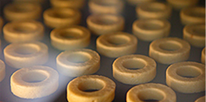 焼成後の和三盆リングサブレ。和三盆糖は熱に弱く風味が変わってしまうため、まぶす前にしばらくの間冷やします。