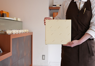 アイボリー色の包装紙に、当店のロゴを小さく印刷をしています。表面には「グロスニス」加工といって、光の当たり方によって当店のシンボルマークがさりげなく光り、高級感と共に上質な印象を与えます。