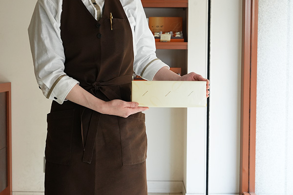 アイボリー色の包装紙に、当店のロゴを小さく印刷をしています。表面には「グロスニス」加工といって、光の当たり方によって当店のシンボルマークがさりげなく光り、高級感と共に上質な印象を与えます。