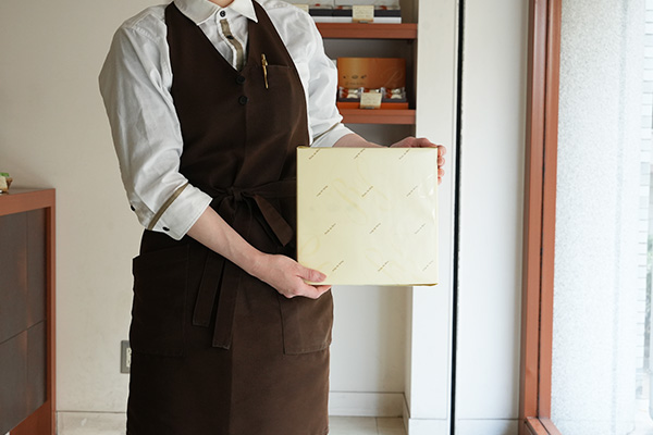 アイボリー色の包装紙に、当店のロゴを小さく印刷をしています。表面には「グロスニス」加工といって、光の当たり方によって当店のシンボルマークがさりげなく光り、高級感と共に上質な印象を与えます。