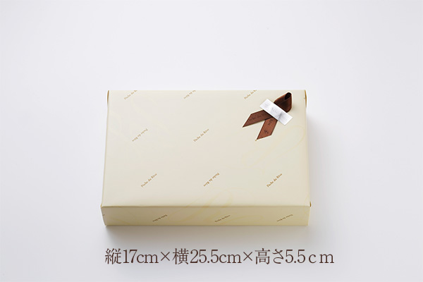 アイボリー色の包装紙に、当店のロゴを小さく印刷をしています。表面には「グロスニス」加工といって、光の当たり方によって当店のシンボルマークがさりげなく光り、高級感と共に上質な印象を与えます。