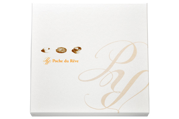 アイボリー色の包装紙に、当店のロゴを小さく印刷をしています。表面には「グロスニス」加工といって、光の当たり方によって当店のシンボルマークがさりげなく光り、高級感と共に上質な印象を与えます。